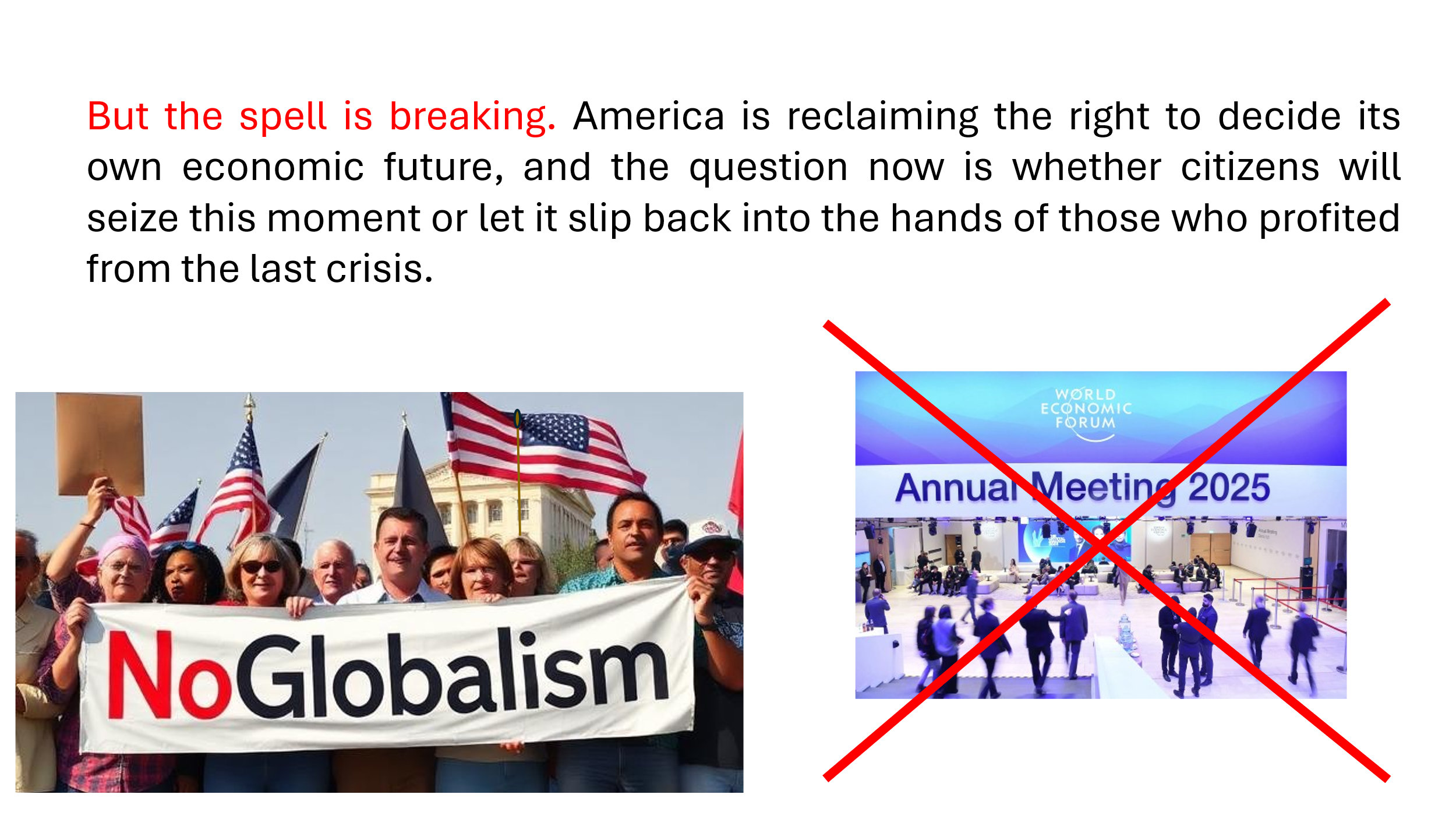 The time to act is now, before the shadows of globalism and the iron grip of transnational elites eclipse the last remnants of our sovereignty.