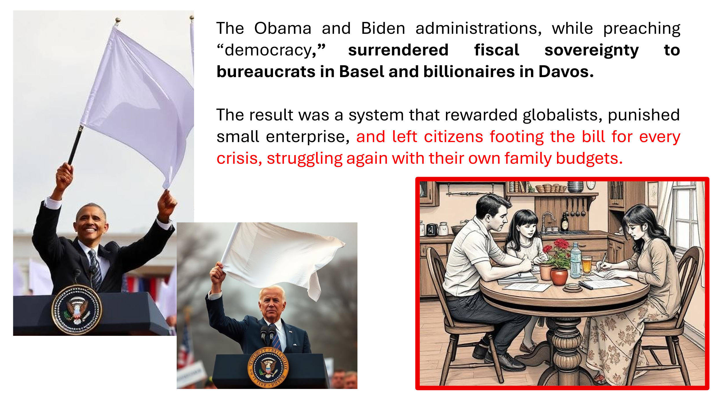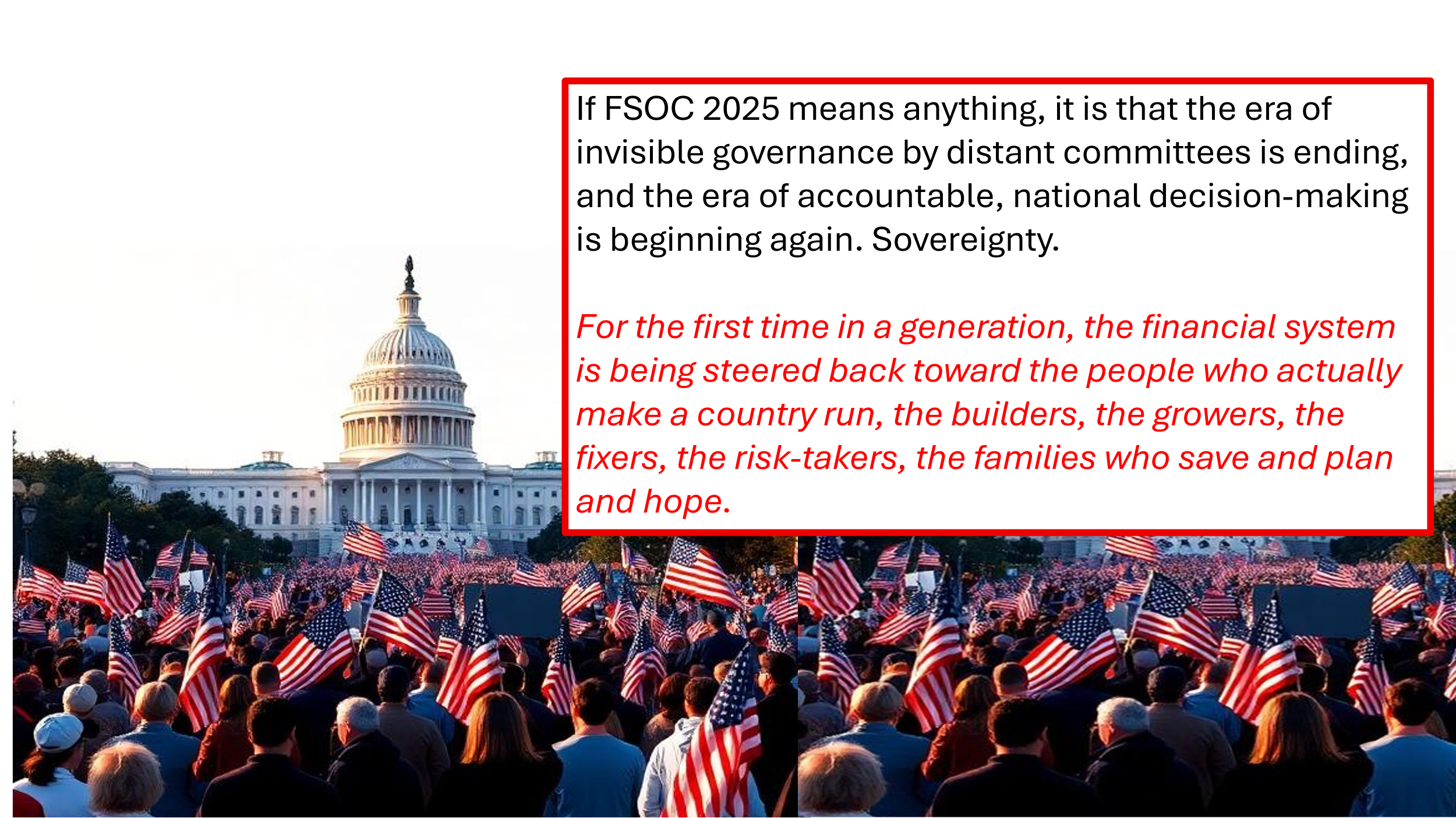 In plain English, America is easing off the Basel straitjacket and reclaiming financial sovereignty. This is not isolationism; it is a recognition that a nation cannot thrive when its financial system is designed in Switzerland and enforced through elite networks that never face the consequences of their own decisions.