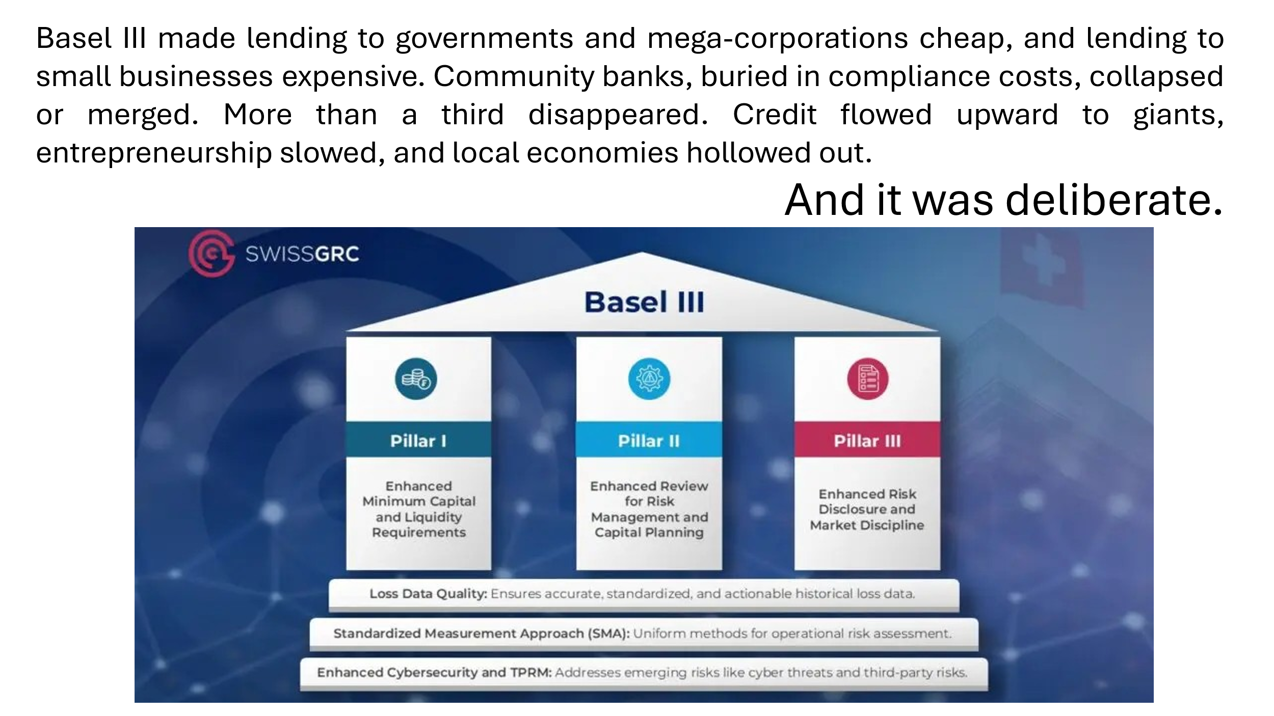 Power migrated from traditional banks to these nonbank giants. At the same time, the U.S. locked itself into Basel III, global rules written in Switzerland that dictated how much capital banks must hold against loans. It sounded technical, but it reshaped the entire credit system.