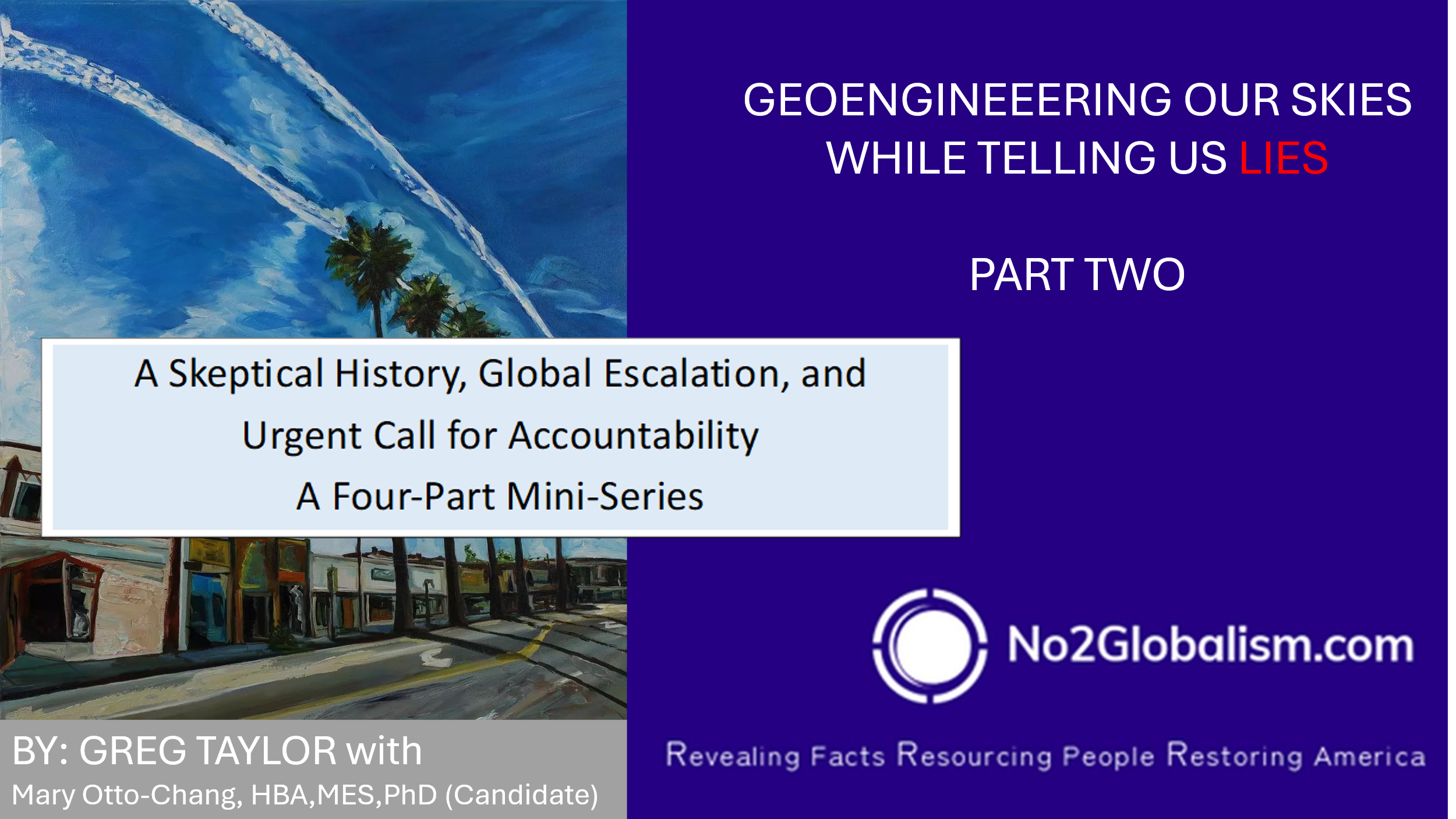 Starting with this mini-series coverage of a critically urgent topic – that of Chemtrails – No2Globalism.com will be presenting this same information, only available as an audio reading, segmented into the same parts as the mini series and playable also in one session.