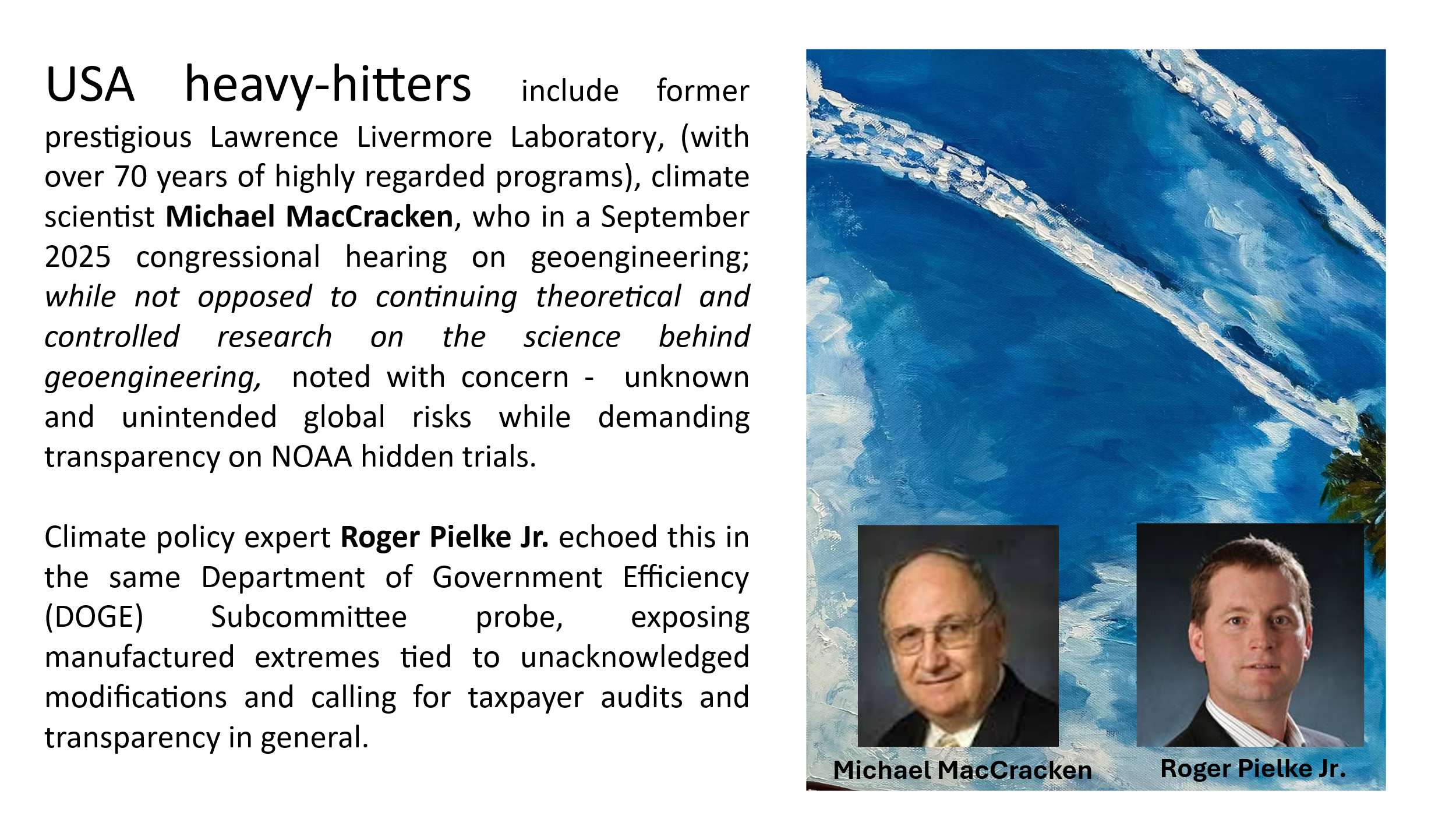 Yet, some states have rebelled. Tennessee banned geoengineering in 2024. By mid- 2025, eight more followed with similar actions banning or towards banning including, Louisiana, Texas, Vermont, Pennsylvania, Florida, Montana, and New Hampshire among them.