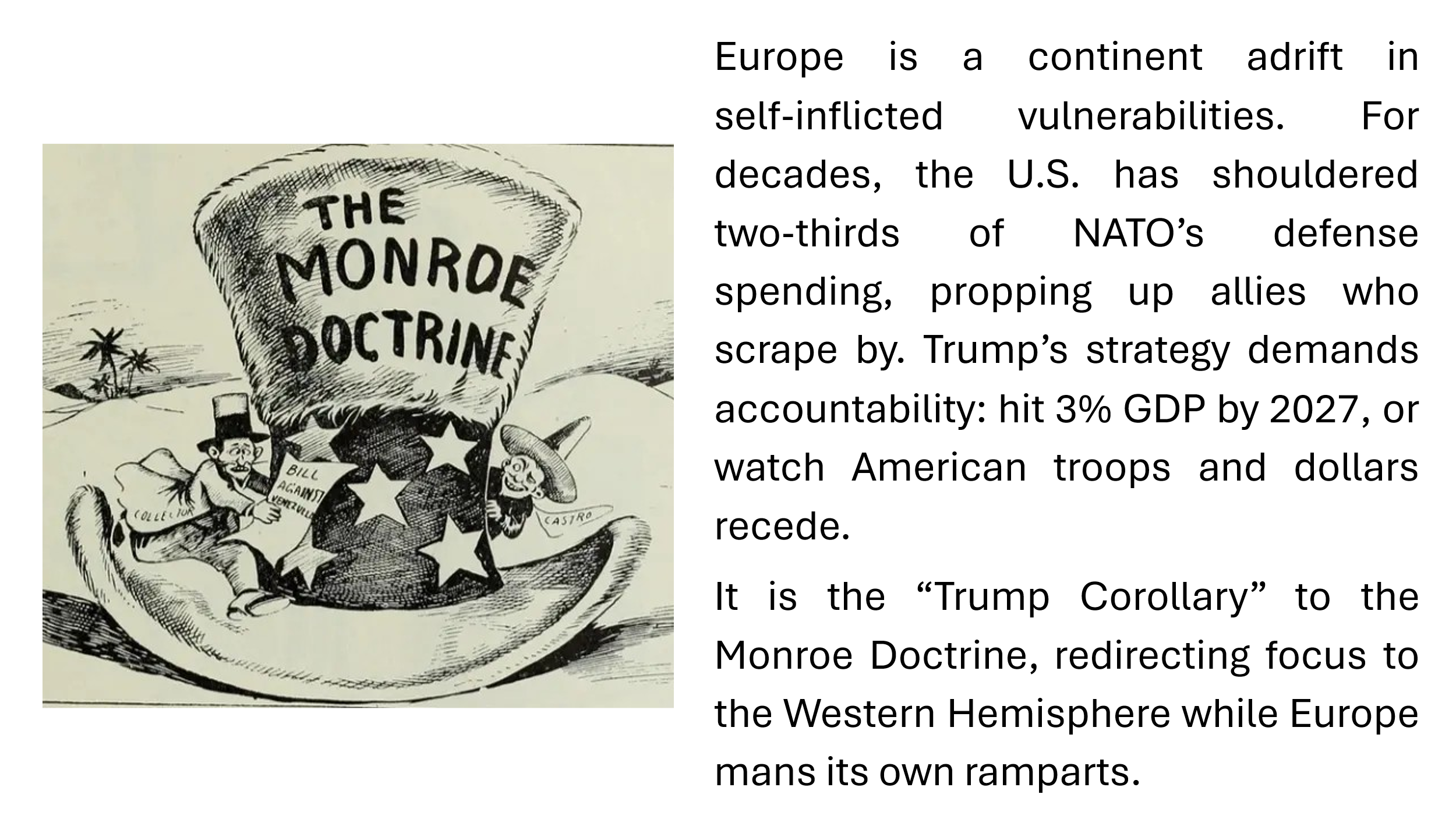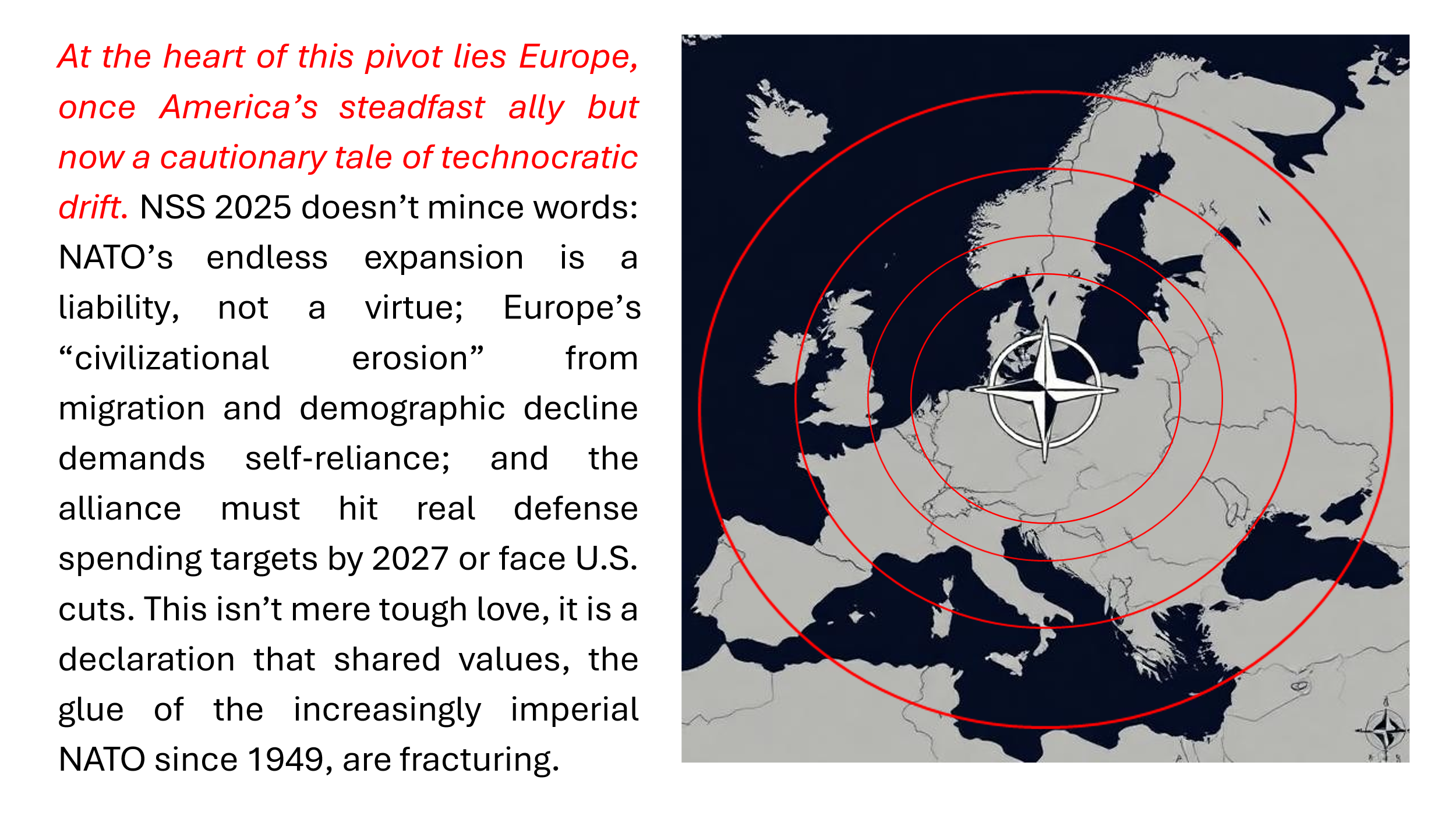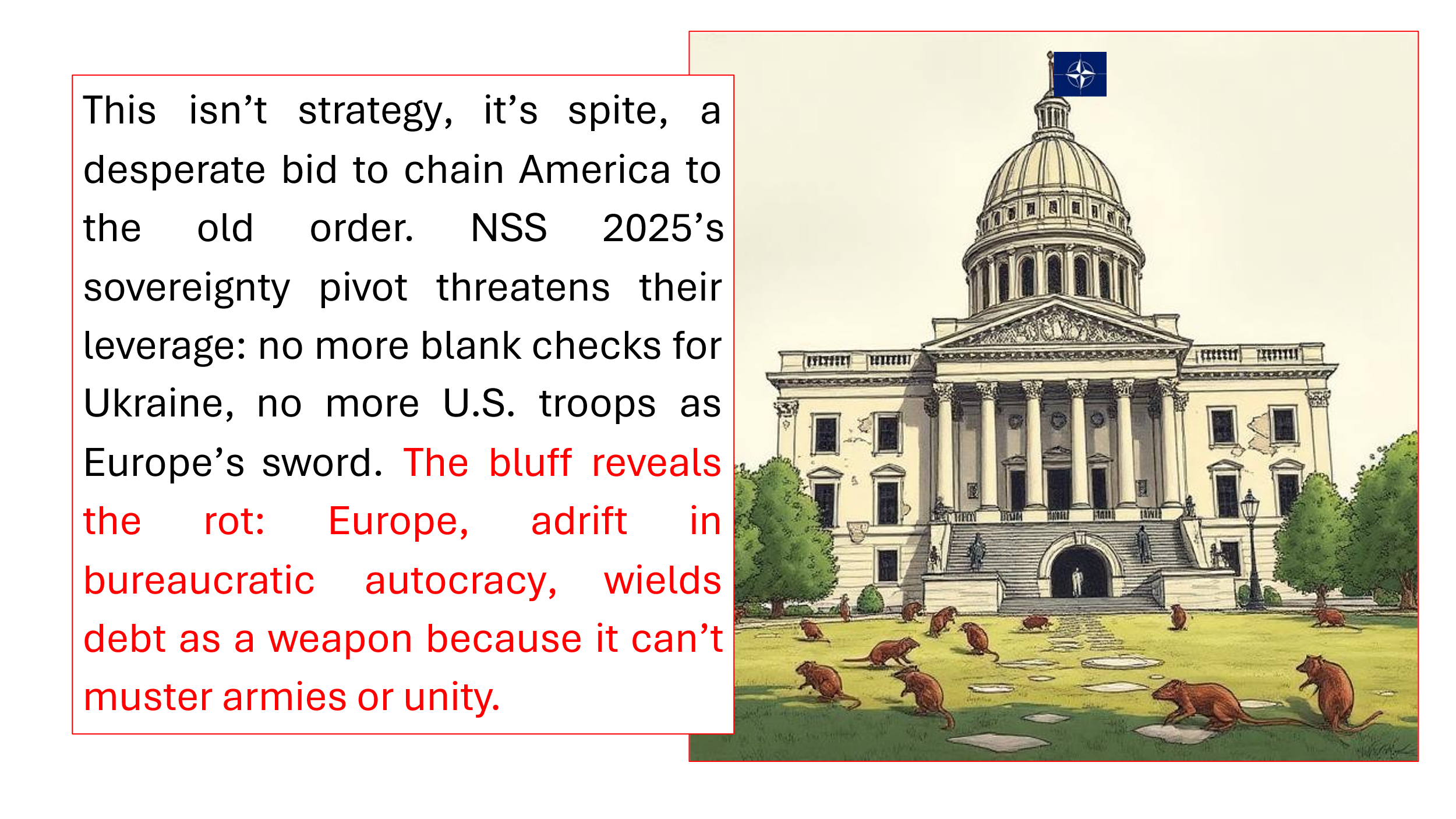 NSS 2025 isn’t anti‑NATO; it is pro‑reform, demanding a leaner alliance of sovereign equals, not a welfare state for the wary. But Europe’s response, prolonging Ukraine, floating Treasury tantrums, signals deeper malaise. When “shared values” mean U.S. sovereignty versus EU technocracy, the alliance fractures.
